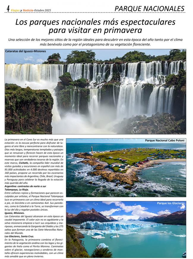 La primavera en el Cono Sur es mucho más que una estación: es la excusa perfecta para disfrutar de lugares al aire libre y reencontrarse con la naturaleza. Días más largos, temperaturas templadas y paisajes que se renuevan y florecen hacen de esta época un momento ideal para recorrer parques nacionales y reservas que son verdaderos tesoros de la región. En este marco, Civitatis, la compañía líder mundial de visitas guiadas y excursiones en español con más de 95.000 actividades en 4.000 destinos repartidos en 160 países, propone un recorrido por los escenarios más impactantes de Argentina, Chile, Brasil, Uruguay y Paraguay para celebrar la llegada de la estación más querida del año.